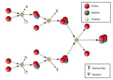 太阳已经在它的核心处进行了50亿年的元素创造,但依然在产生氦原子。具体来说,两个氢原子核也就是两个质子相互碰撞,形成包含一个质子和一个中子的氘原子核(2H),同时放出一个正电子和一个中微子。 氘原子核随后可以结合一个氢原子核转化为氦的同位素3He。两个3He原子核可以合成一个4He原子核并且释放出两个质子。