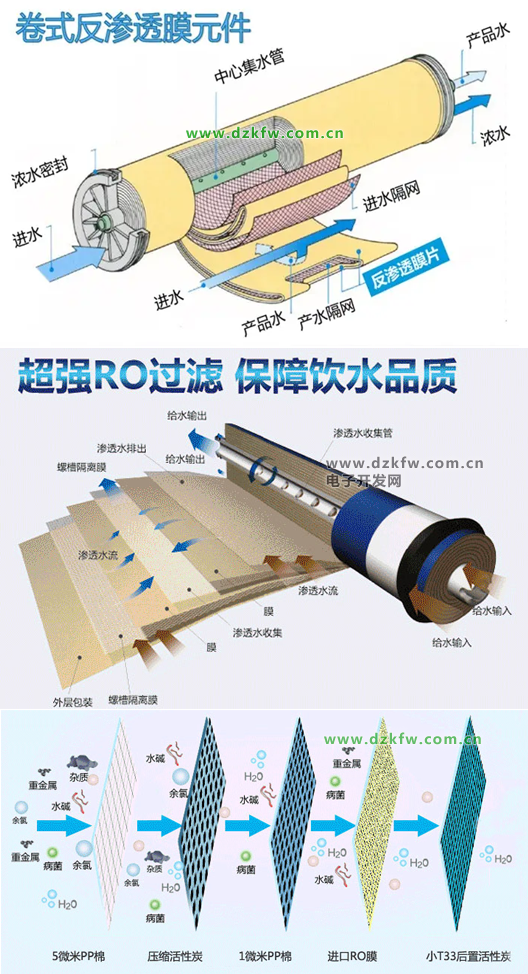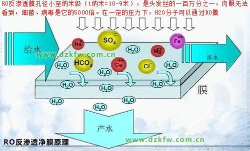 RO是英文Reverse Osmosis的缩小,中文意思是[反渗透],一般水是由低浓度的一边流向高浓度的一边,水一旦加压之后,将由高浓度的一边流向低浓度的一边,亦即所谓的反渗透原理;由于RO膜的孔径是头发丝的一百万分之一,肉眼无法看到,细菌、病毒是它的5000倍,因此,只有水分子能够通过,其它杂质及重金属均由废水管排出,所以海水淡化的过程,以及太空人废水回收处理均采用此方法,是体外的高科技人工肾脏。