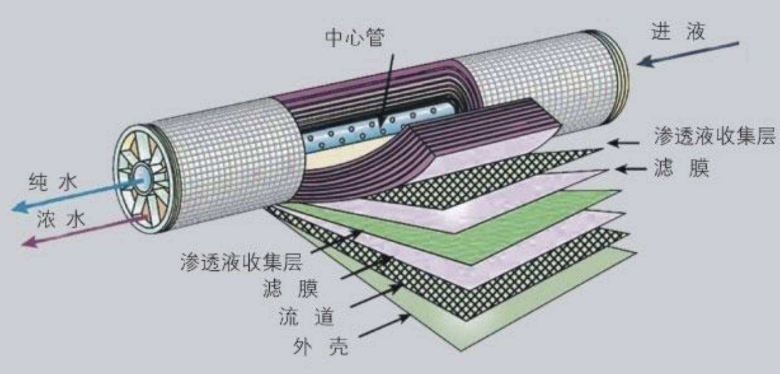 在之前的文章中,我们曾经提到过,反渗透膜元件为螺旋卷式结构,由多页膜袋组成,将废水导流网、RO膜、净水导流网三边分别涂胶密封,第四边开口贴合于有孔的导水管上,将膜袋按照同一方向卷起,就成了我们所见到的反渗透膜。