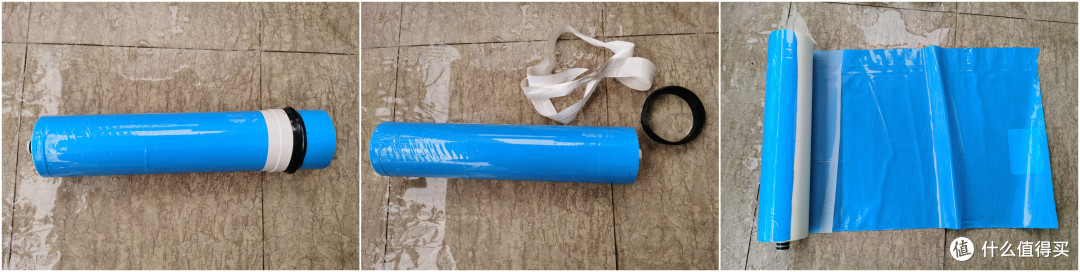 首先将RO膜滤芯拆解开,可以分为:导水管、封套、废水导流网、RO膜、净水导流网、密封环、橡胶密封圈、密封胶带。