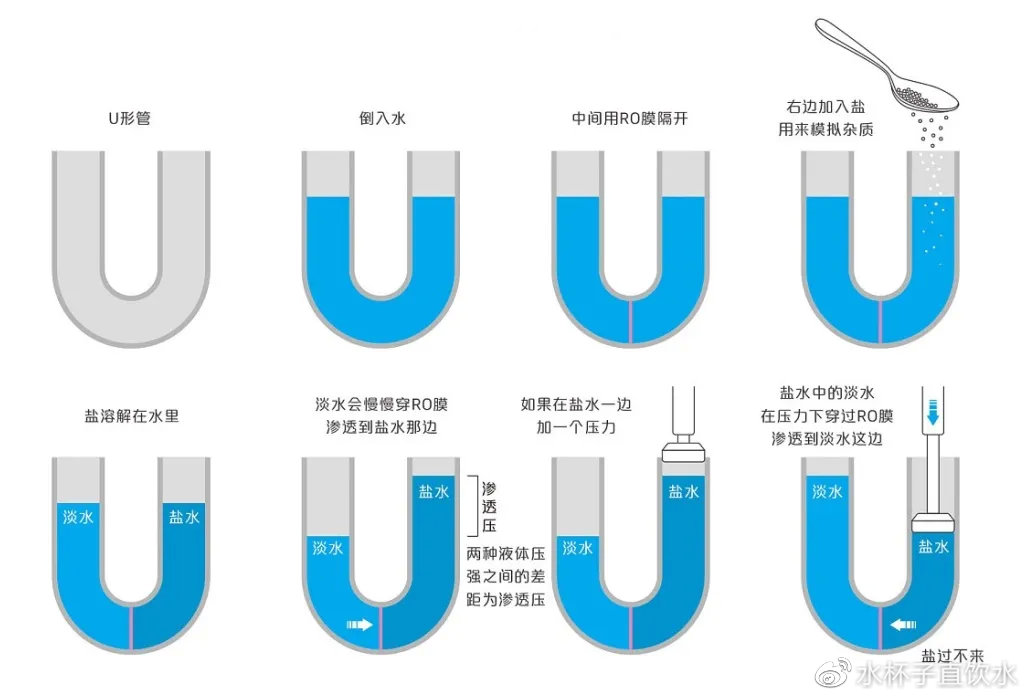 所谓渗透,自然界中表现为在液体中溶解物质,浓度低的溶液会透过半透膜向浓度高的溶液方向运动,而反渗透是通过对高浓度溶液进行人工加压,实现水分子的反向渗透,完成水的净化过程。