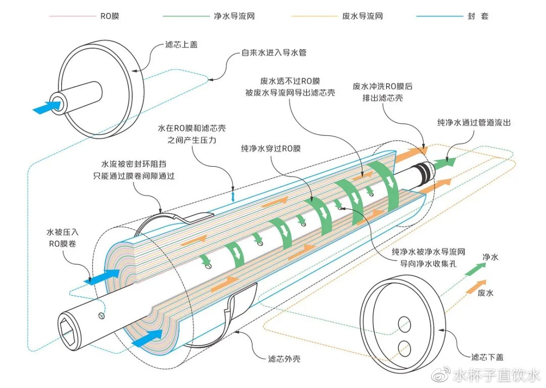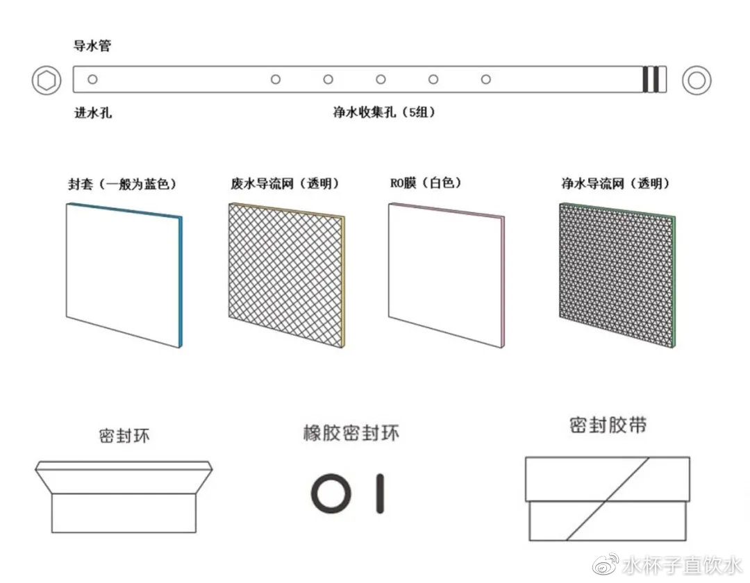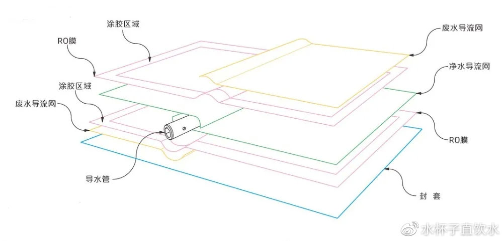 净水导流网网格细,贴合导水管,引导纯净水流向净水收集孔,并防止两片RO膜贴在一起;废水导流网网格粗,用于导流废水同时支撑柔软的RO膜;最后使用封套和密封环共同密封原水和废水。