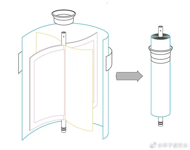 当水流进入RO膜滤芯后,从膜卷间隙通过,由于外壳与自来水之间产生压力作用,水流穿过层层膜片得到过滤,纯净水被净水导流网引入导水管的净水收集孔,并被压入压力桶,含有杂质的废水无法通过RO膜,被废水导流网引导至废水口排出,废水的流动同时冲洗了RO膜表面,带走部分杂质。