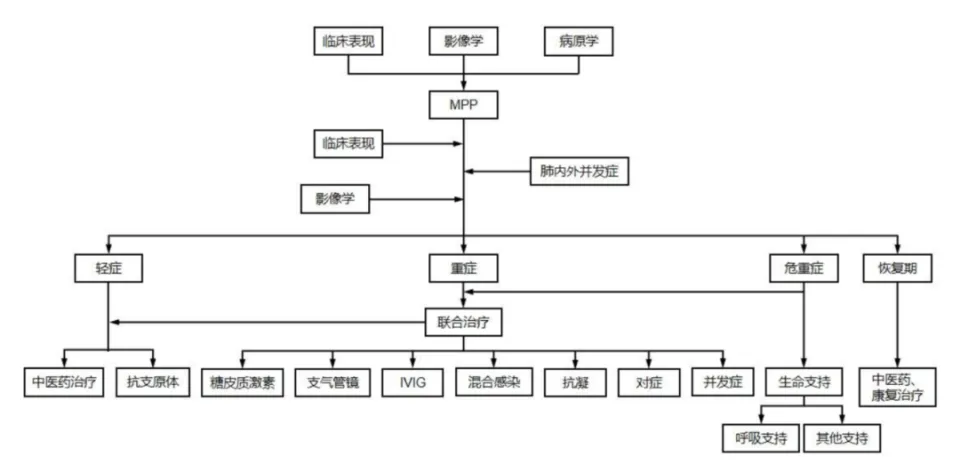 重点是早期识别和治疗重症肺炎支原体肺炎(SMPP) 和暴发性肺炎支原体肺炎(FMPP)。重症联合治疗的最佳窗口期为发热后 5-7d,经治疗后,在病程 7-10d 以后仍持续发热,病情无好转者,遗留后遗症的可能性大。