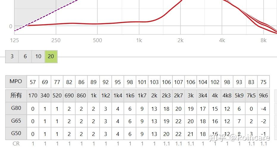 第一行,MPO:各个频率声音的最大声输出限制值,设定后助听器在这个频段最大也只能输出设定的声音强度,通常有UCL