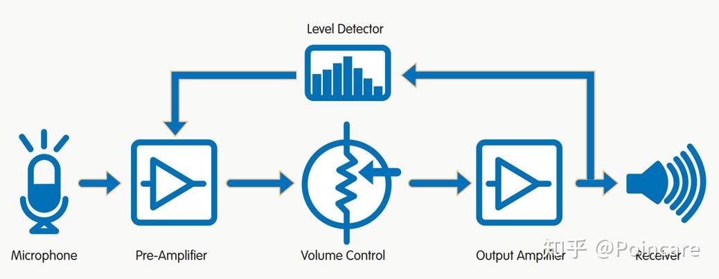 工作原理非常简单,由麦克风采集声音,通过数字处理芯片对采集到的声音信号进行放大、降噪等一系列处理,最后经受话器将处理后的电信号转换为声信号播放。如下图所示: