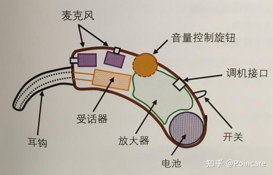 助听器整机由以下几部分组成,下图为较老的耳背机构造示意图
