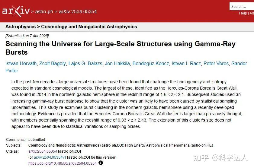 “伽马射线暴”通常源于超新星爆发、中子星合并等极端事件,由于这样的事件是由大质量恒星产生的,大质量恒星的形成又需要大量的物质,而这种条件,基本上只有在恒星云集的星系中才会具备,因此“伽马射线暴”在天空中的分布,就成了示踪遥远星系的有力工具。 早在2013年,科学家就通过分析当时已知的“伽马射线暴”观测数据,发现武仙座与北冕座之间,存在着一片“伽马射线暴”异常密集的区域,而这也让科学家首次意识到,那里有一个极为庞大的宇宙结构。
