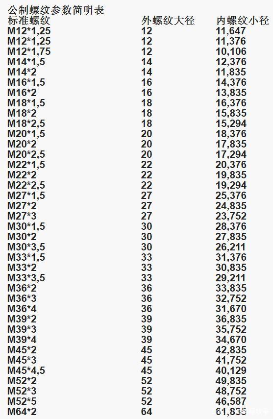 | 规格 | 标准径 | 2级牙钻孔径 | 规格(UNC) | 标准径 | 2级牙钻孔径 | ||