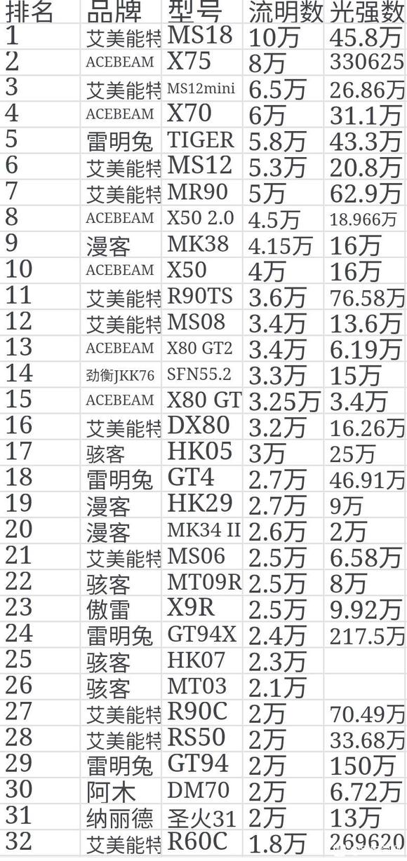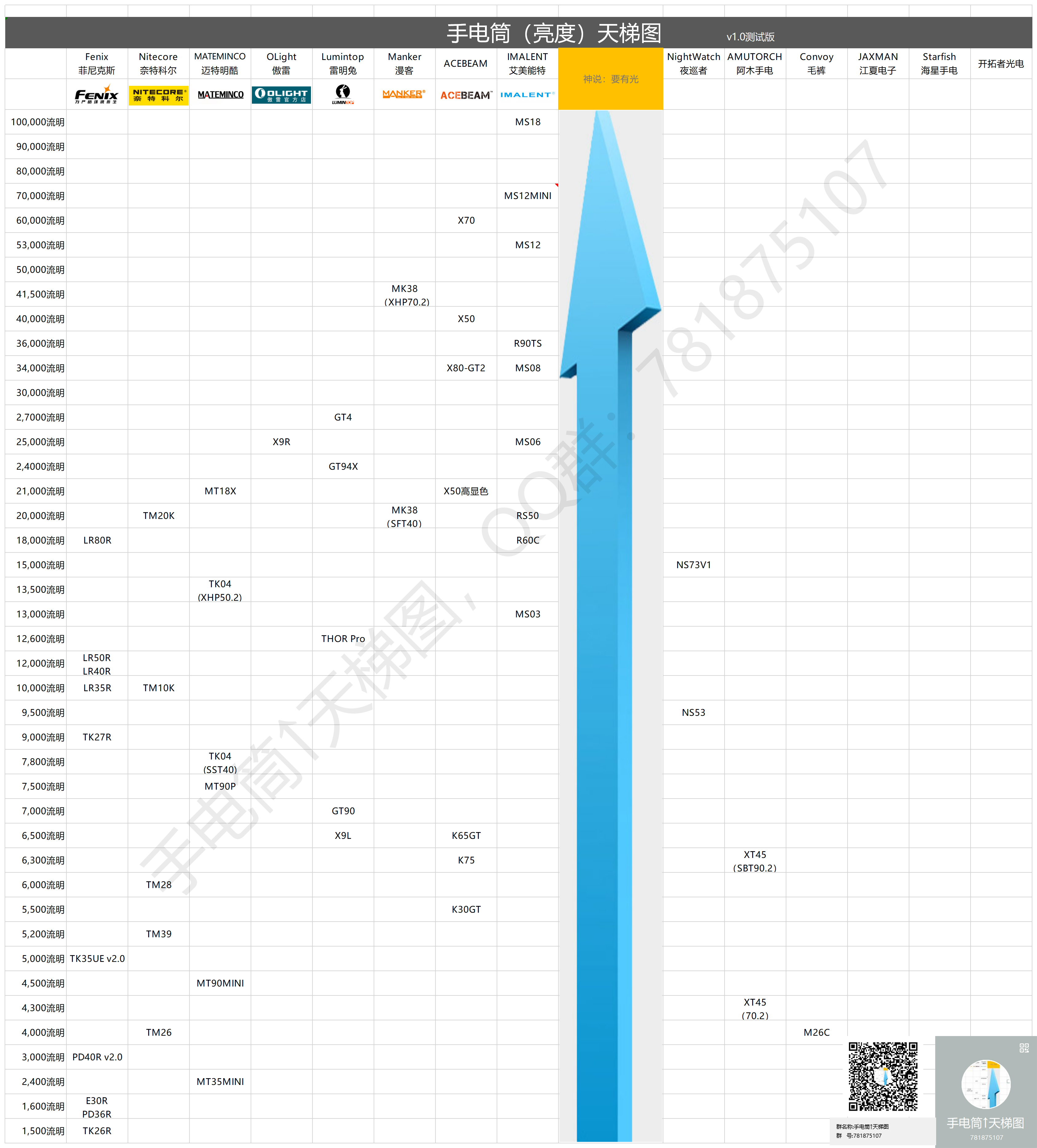 发布的初衷就是“抛砖引玉”,主要涉及品牌手电筒范围(DIY领域后续会慢慢更新进去)。让筒友一起来做校对与纠错,由于这个版本的参与者相对较少,所以发出来难免可能会有错误,也可能不全面,更可能丢失某个品牌的代表性手电筒,欢迎筒友指出并给出正确答案,也欢迎你们直接在楼层反馈,或者加群获取最新天梯图。