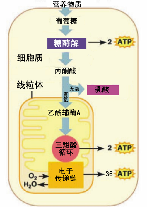 葡萄糖参与糖酵解和氧化磷酸化。糖酵解发生在细胞质中,将葡萄糖转化为丙酮酸(产生两个分子 ATP),继而转化为乳酸或乙酰辅酶A (在线粒体中)。 脂肪酸代谢也会产生乙酰辅酶A。