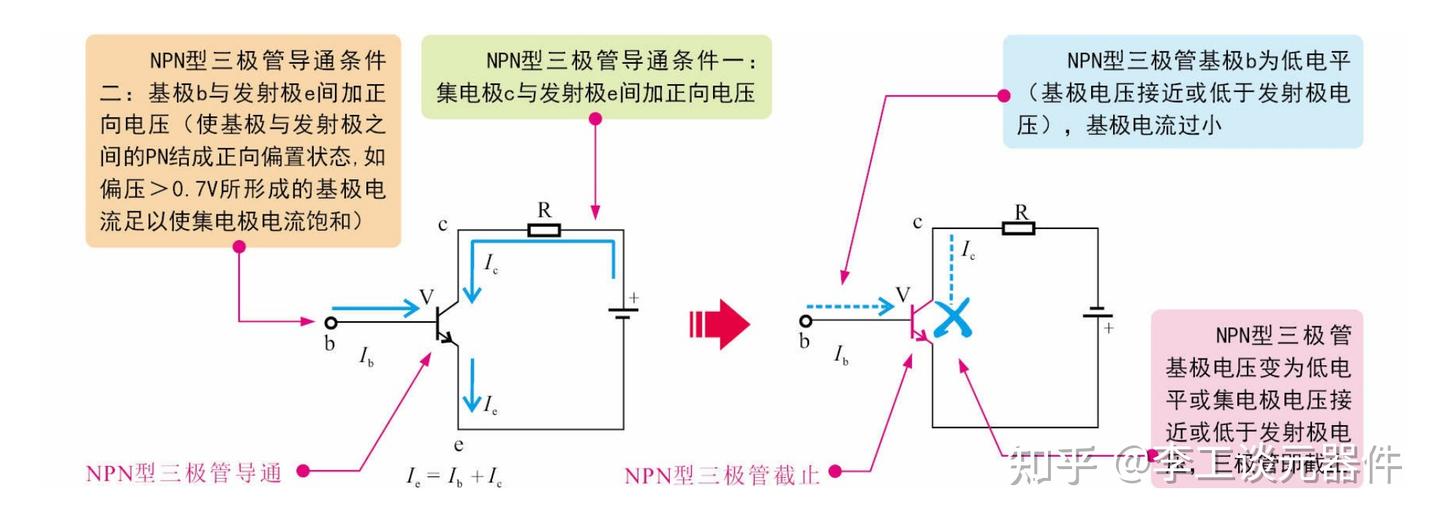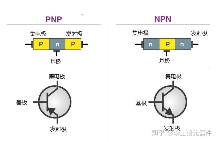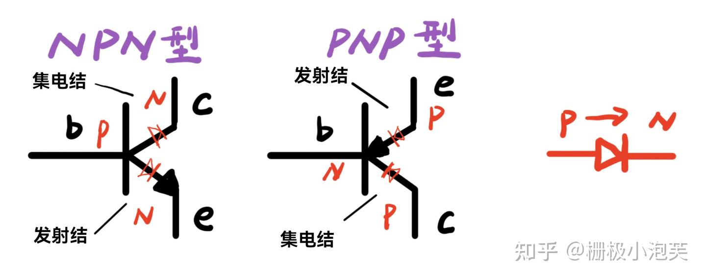 ”,如图,我们可以把三极管理解为两个二极管背对背(NPN)/两个二极管面对面(PNP),了解箭头指向就能轻松区分是NPN还是PNP。