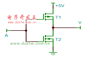 用1个NMOS和1个PMOS搭建的非门;当A为高电平时,T1截止,T2导通,Y为低电平;当A为低电平时,T1导通,T2截止,Y为高电平。