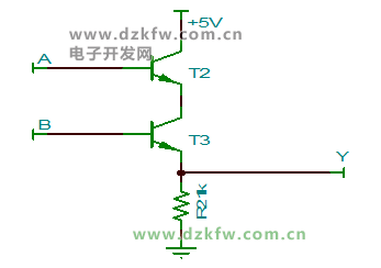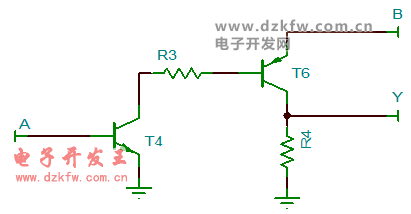 用1个NPN和1个PNP搭建的与门,当A和B均为高电平时,T4和T6都导通,Y为高电平。