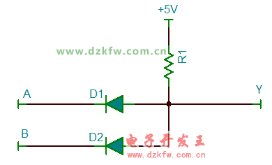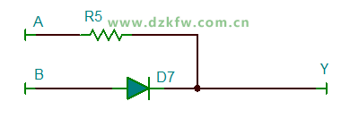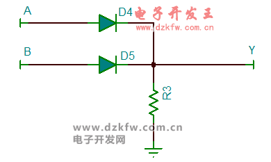 用两个二极管组成的与门,A和B都为高电平时,Y才为高电平。