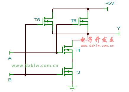 A=0,B=0时,T5和T6导通,T3和T4截止,Y=1