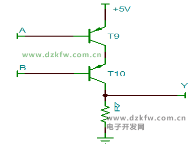 用2个PNP三极管搭建的或非门,A和B只要有一个高电平,Y就为低电平;当A和B都为低电平时,T9和T10均导通,Y为高电平。