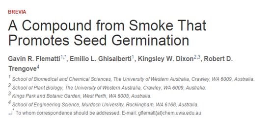十多年前,澳大利亚的科学家也有着类似于白居易的发现,他们发现火灾后的树林中野花长的特别快,他们坚信野火中隐藏着春风吹又生的原因,于是他们用色谱质谱分离灰烬中的化合物,找到了一种分子能够促进种子萌发,他们命名为Karrikin,发表在Science上。