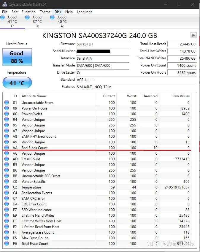 而且,要弄清固态硬盘是否出现故障很难,但有一些固态硬盘故障的迹象,如错误、崩溃和其他问题,可能会在你丢失数据前给你提示。 这些迹象,可能表明固态硬盘出问题了与硬盘上的坏扇区一样,固态硬盘颗粒上也会有坏块(bad block)。固态硬盘的坏块错误是指计算机尝试读取或写入文件,但耗时过长而导致失败。由于读取或写入时间过长,进程失败并发出有关坏块的错误信息。 坏块影响文件的方式有两种: 系统在向硬盘写入数据时检测到坏块,从而拒绝写入数据。 系统在写入数据后检测到坏块,从而拒绝读取数据。 在第一种情况下,数据从未写入硬盘,因此不会损坏。通常,系统会自动解决这个问题。但在第二种情况下找回数据并不容易。你可以尝试一些第三方工具从故障的固态硬盘中恢复数据,但不要抱太大希望。一般来说,不返厂情况下,损坏的固态硬盘通常意味着这些坏块上存储的任何数据都将永远丢失。 出现坏块的常见症状有:文件无法读取或写入硬盘;提示电脑/文件系统需要修复;活动的应用程序经常卡死和崩溃;在固态硬盘内移动文件时经常出错;运行缓慢,尤其是在访问大文件时。系统随机蓝屏崩溃。 此时如果用CDM工具查看,会发现AA信息及坏块数量统计。